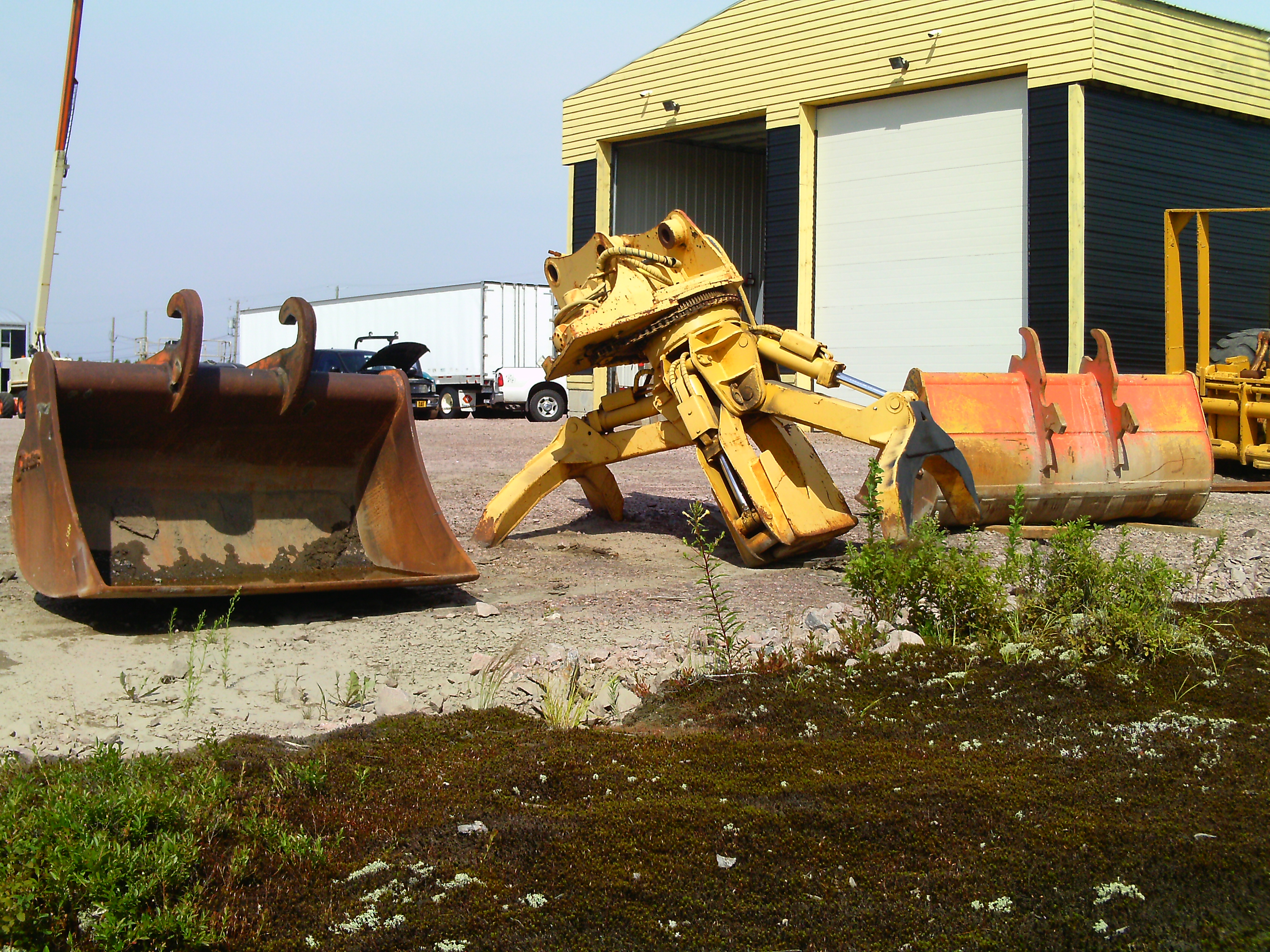 Plusieurs godets, grapins, marteaux, etc..